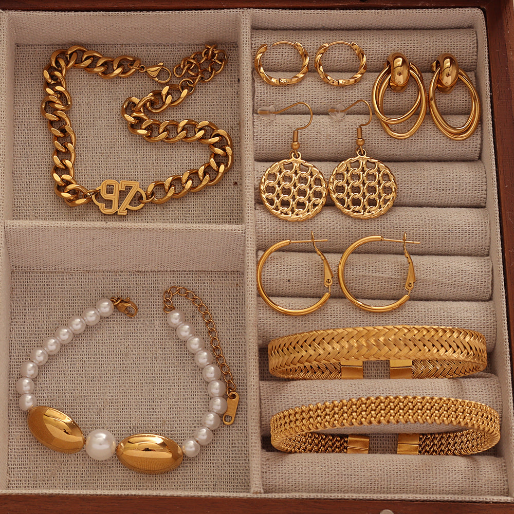 Materials: Stainless steel with 18K PVD gold plating. Hypoallergenic; water & sweat-resistant.