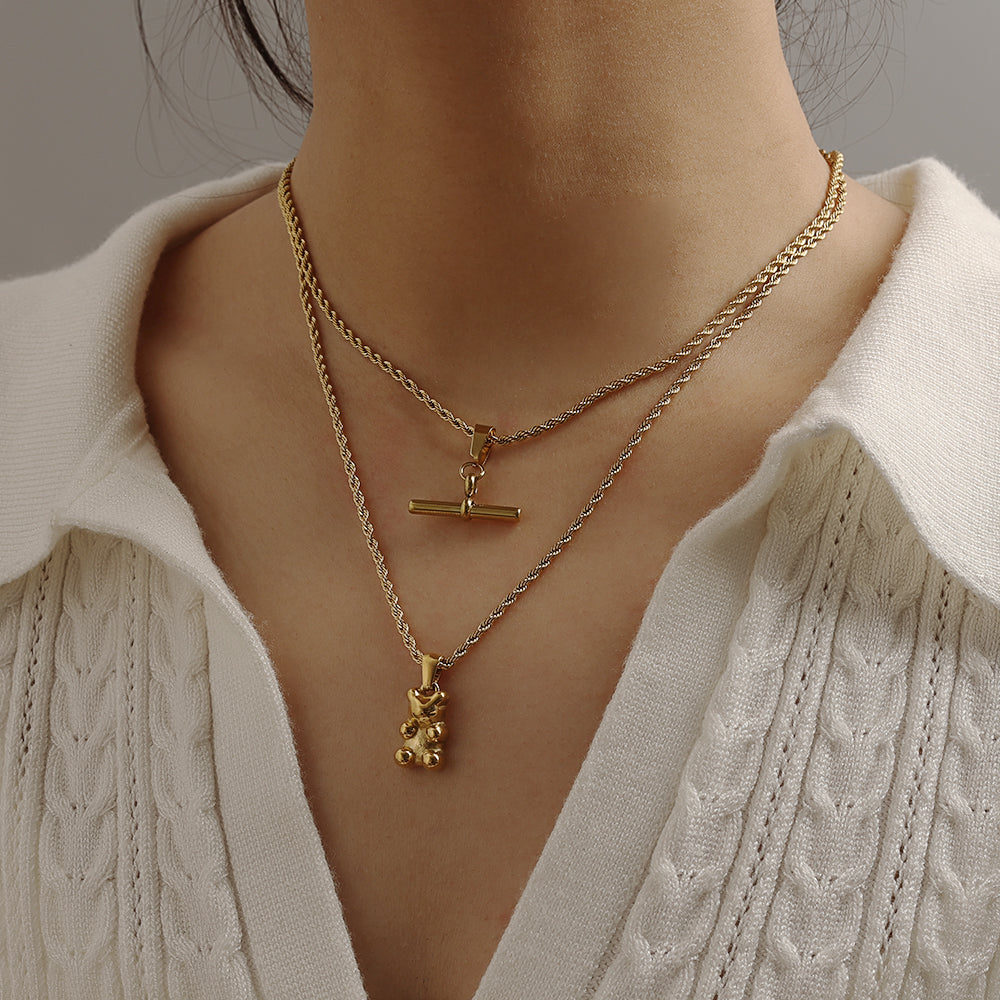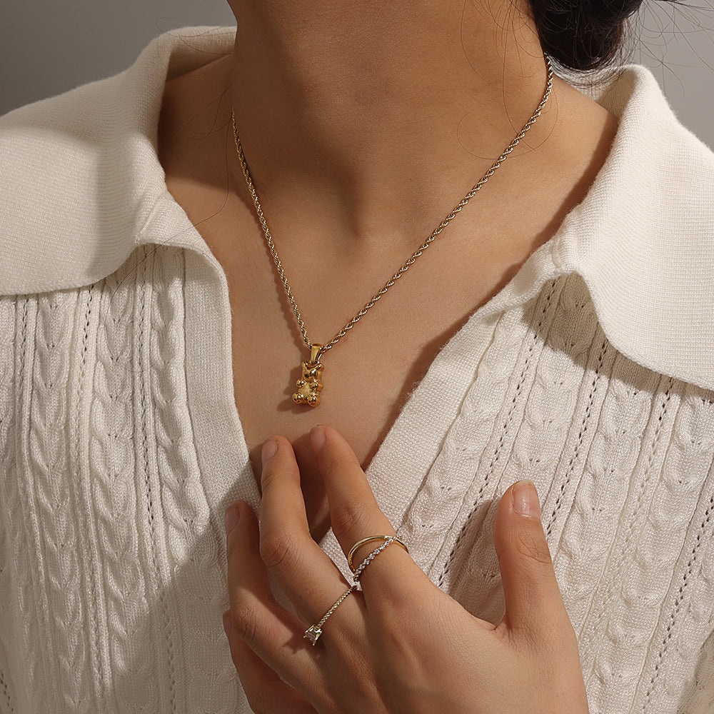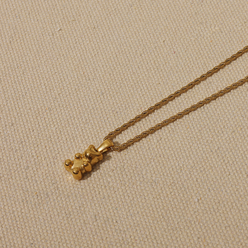 A polished teddy bear charm on a slim chain—cute, stackable and gift-ready.