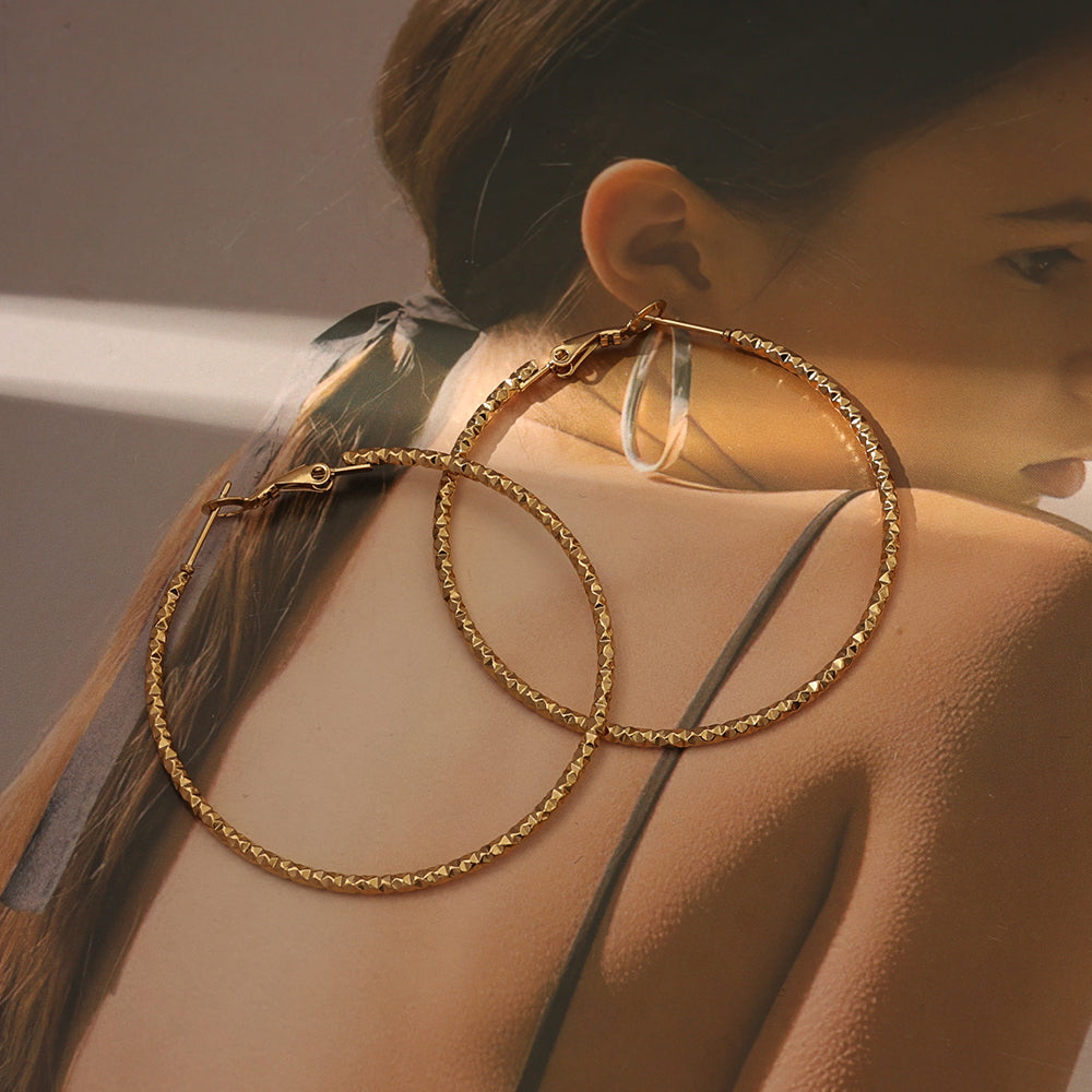 Lightweight 50 mm hoops with a fine texture—big look, comfy wear.